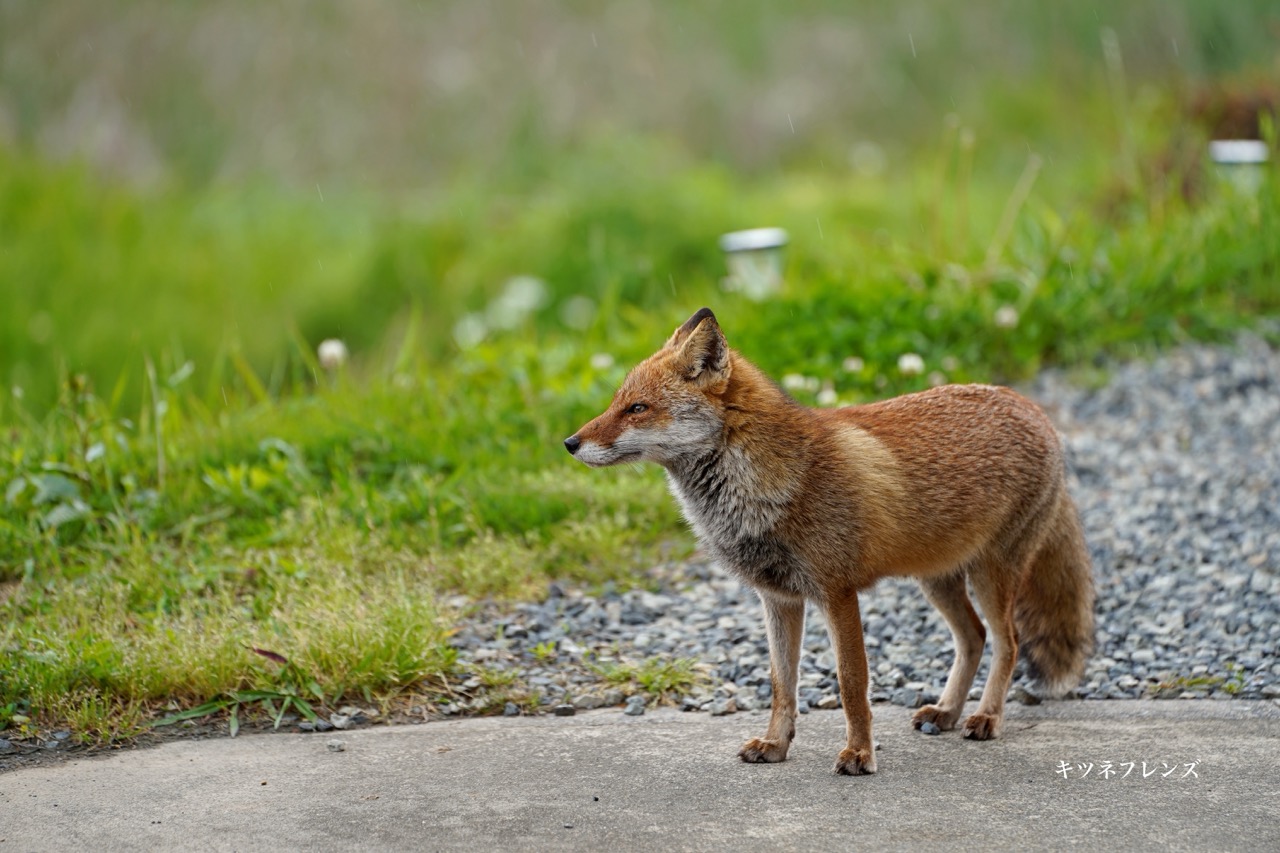 北海道にいるキタキツネとは同じアカギツネの仲間ですが、キタキツネの方が体が大きく、脚先が黒い“靴下”を履いたような毛色が特徴です。キタキツネは人馴れした個体もいますが、ホンドギツネはより慎重で、物陰からそっとこちらをうかがうような生き方をしています。