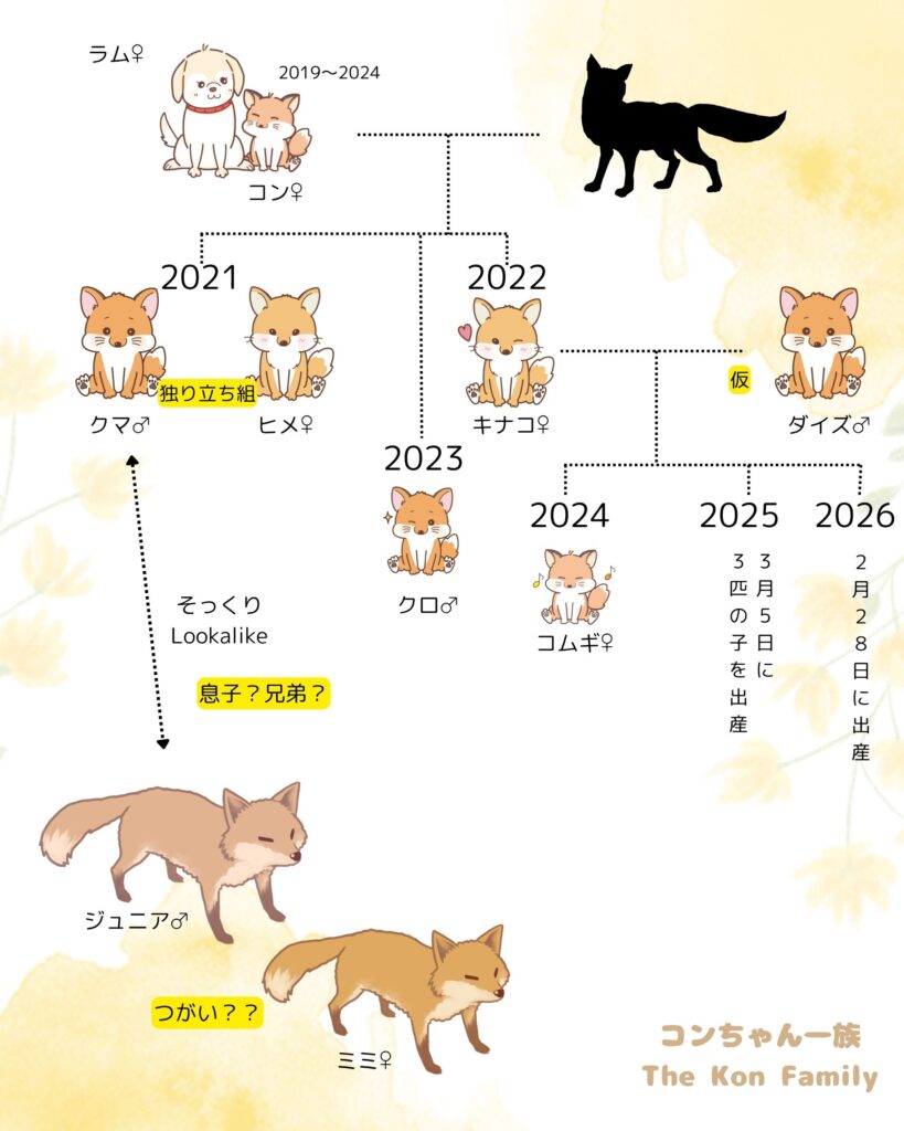 2024年2月、コンちゃんがこの世を去ると、キナコちゃんが引き継ぐように家族の中心として現れるようになり、キナコちゃんの娘・コムギちゃん(♀)、そして家族のクロちゃん(♂)へと引き継がれました。